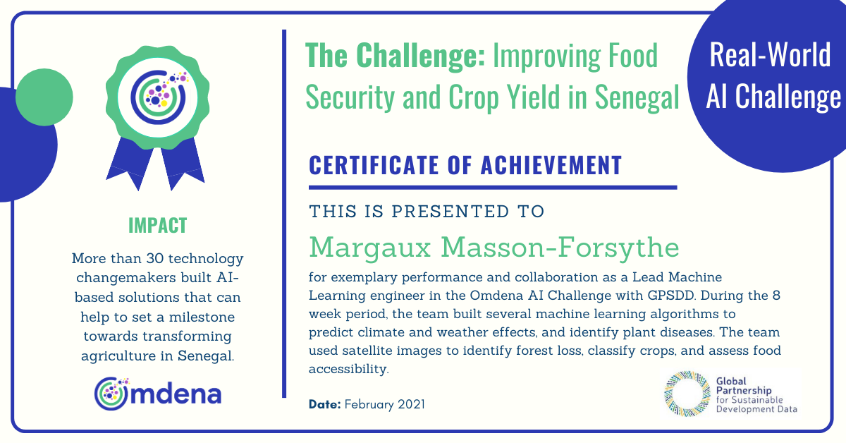 "Margaux Masson-Forsythe and Praveen Kanna did a great job facilitating the project progress using deep learning and remote sensing and thus got promoted to Lead ML engineers."